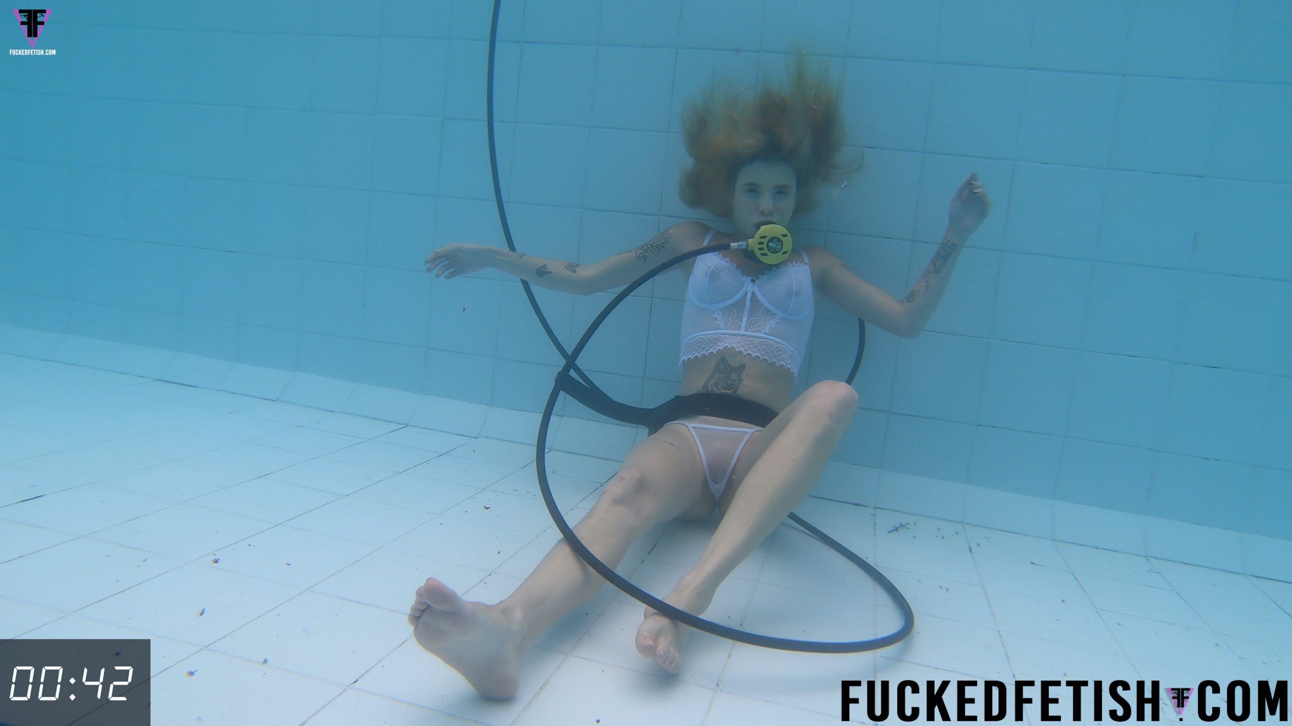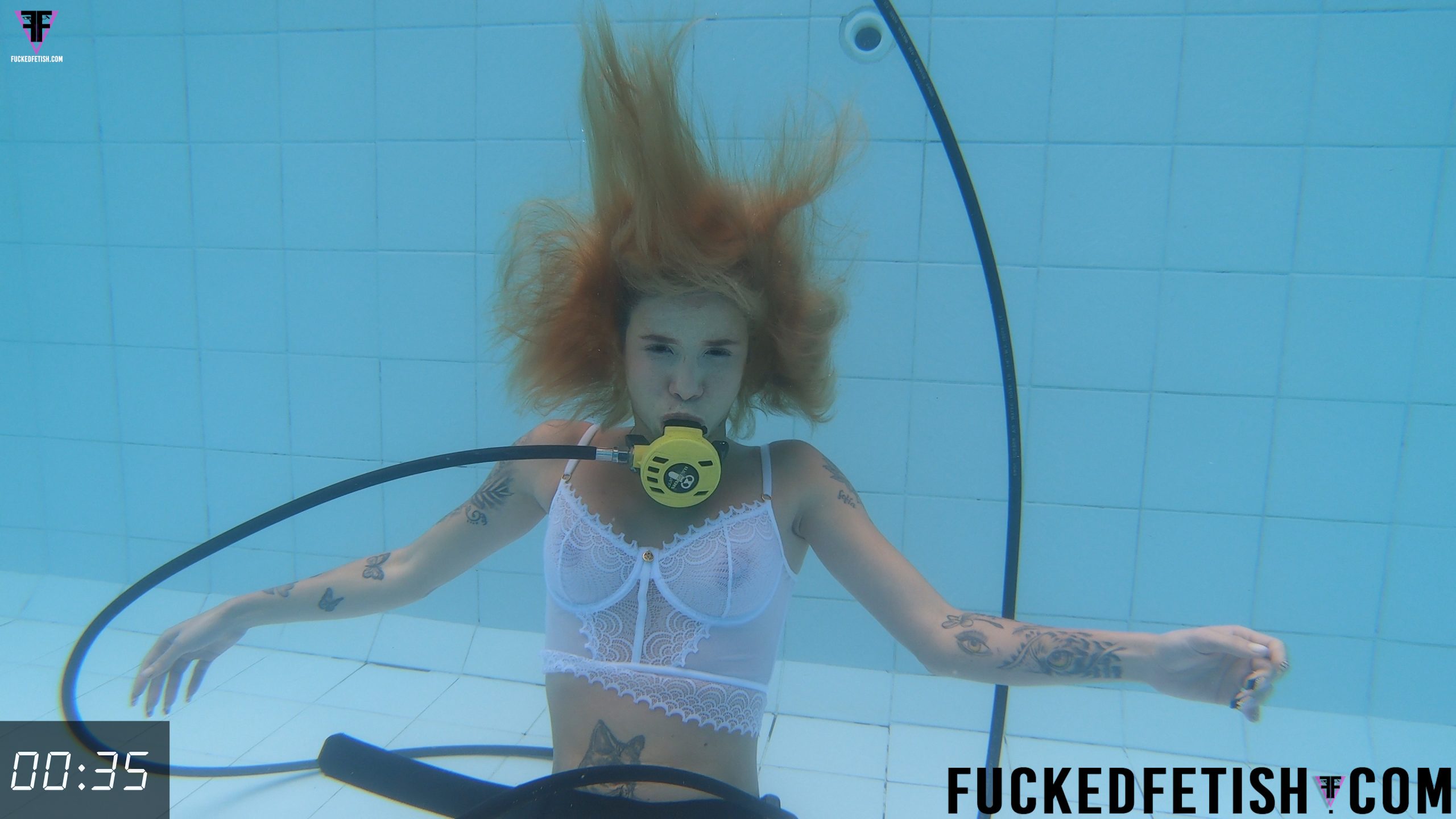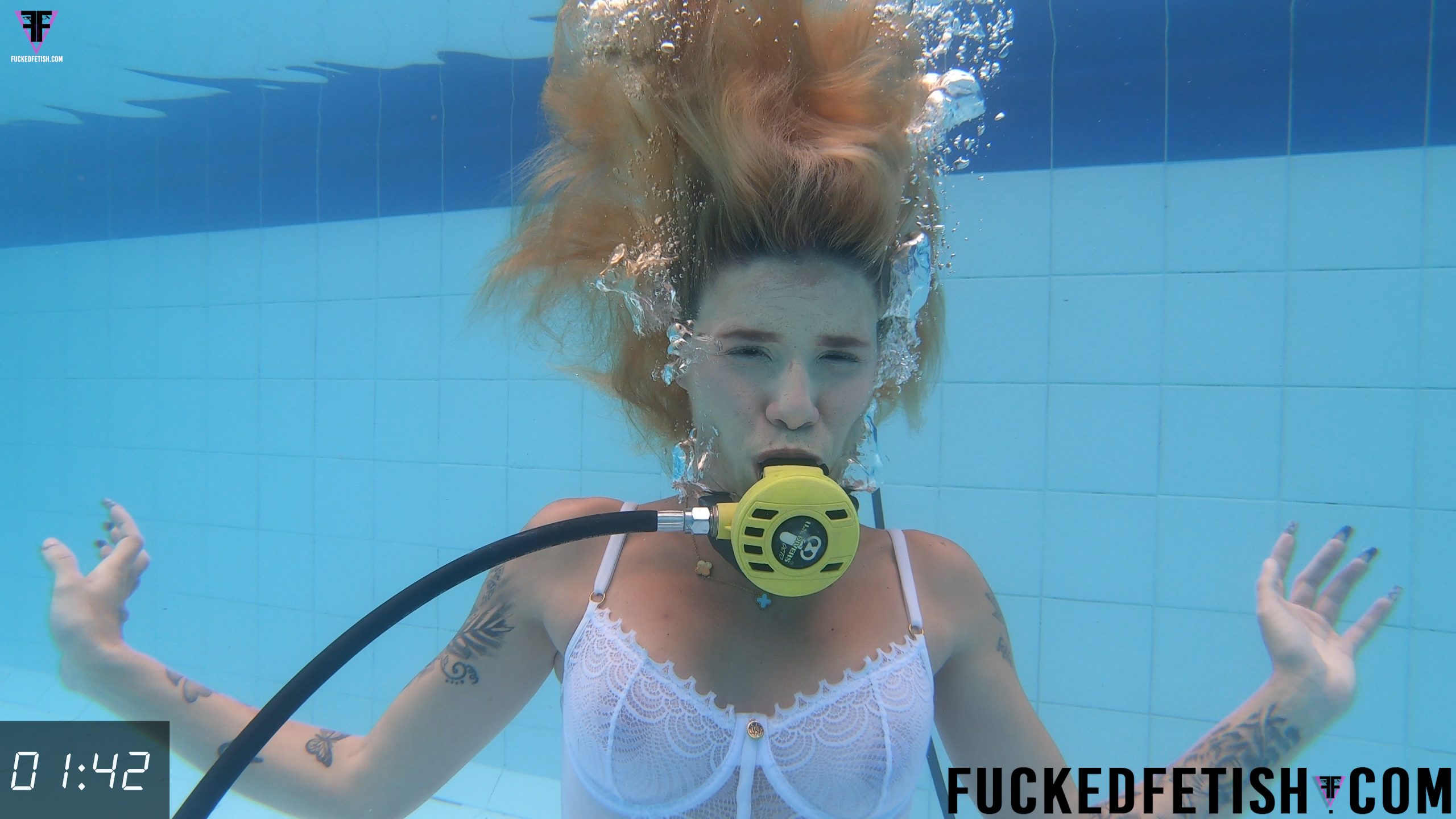 Ashlee Rose usando un conjunto de lencería color blanco nos seduce con sus piernas abiertas mientras se acaricia y gime. Ella tiene un wet look muy sexy y ahora está en la piscina con el scuba tank. Ella se sumerge y tiene los ojos abiertos sin usar dive mask. Burbujas salen de su boca mientras su pecho tiene contracciones. Ella remueve el scuba y su cuerpo queda suspendido en la densidad del agua. Ella rápidamente coge de nuevo el scuba mientras nada bajo el agua y flota en el fondo de la piscina. Su cuerpo rápidamente está estático mientras su cabello dorado flota y se mueve en el agua. Su cuerpo estático combina los movimientos y las contracciones en su pecho. Ashlee se desplaza nadando por la piscina mientras aumentan las contracciones en su pecho. Ashlee remueve su ropa interior y su cuerpo ahora está completamente desnudo mientras abre las piernas y se masturba con las manos. Ashlee gime bajo el agua en el fondo de la piscina. Ashlee remueve el scuba, su pecho tiene contracciones y sus senos rebotan. Ashlee intercala el scuba con la masturbación y los gemidos acuáticos. Finalmente sale a flote. Human content. No AI. Support human content. Enjoy this underwater trip, with 98% aquatic sound, surrounded by bubbles and a scuba tank. This film was made by professionals with all the care. Leave us your comments. Custom open.